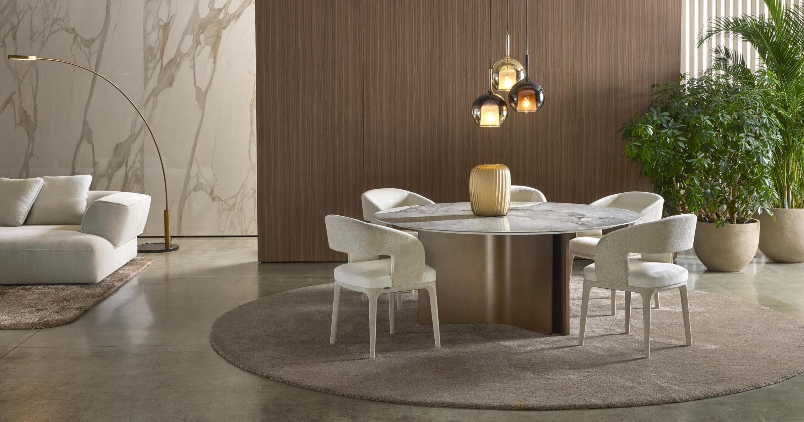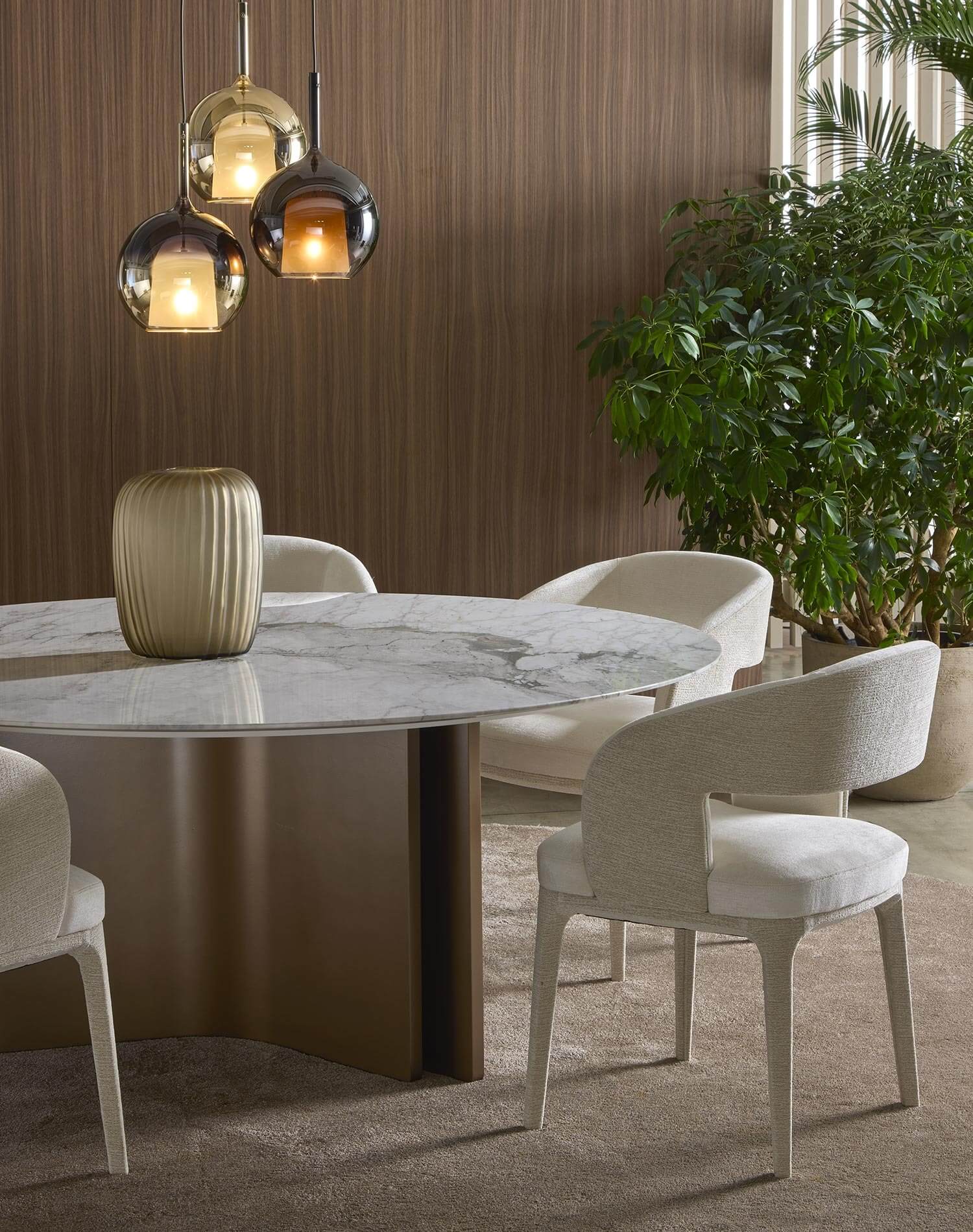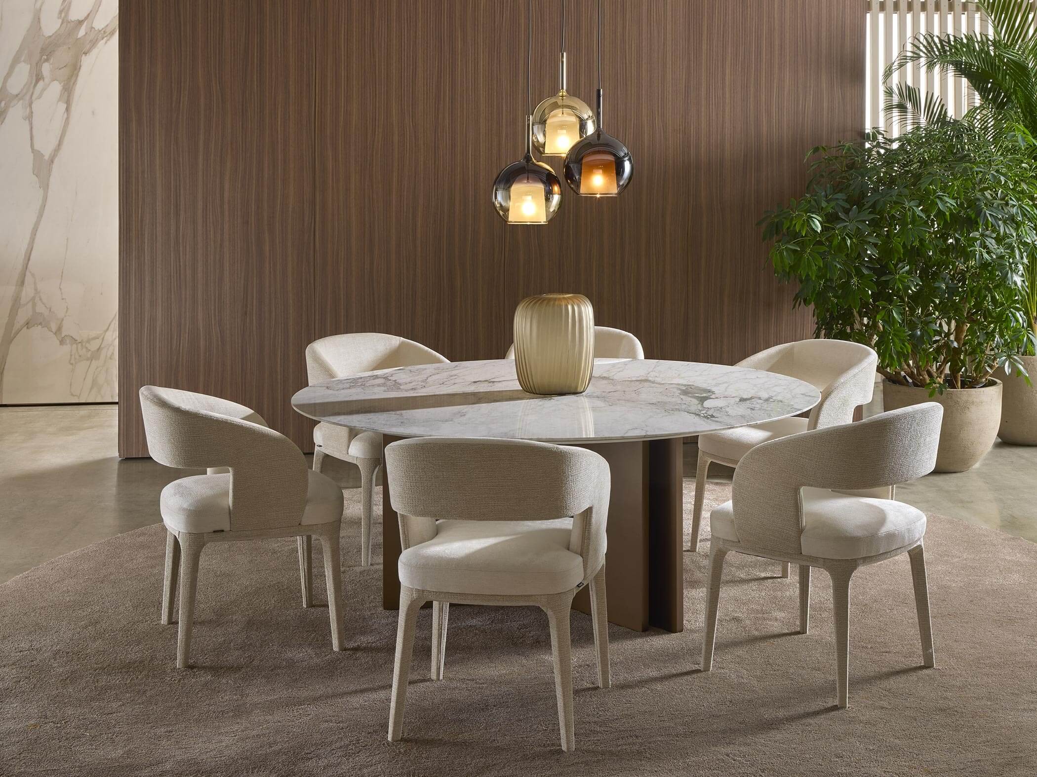 Bea 提供椅子和凳子兩種款式,並可選配扶手,以滿足不同的設計需求。實木底座確保了穩定性和精湛的工藝品質,並可選擇織物或皮革軟墊,打造更精緻的飾面。軟墊座椅提供豐富的布料選擇,更可採用兩種不同的材質(例如織物和皮革)進行組合,營造出精緻的材質對比,展現獨特品味。