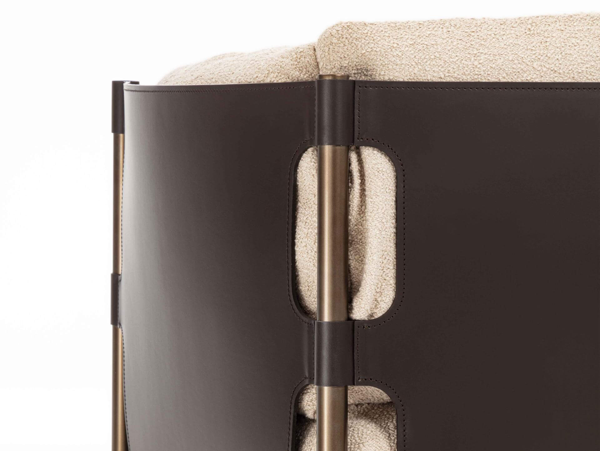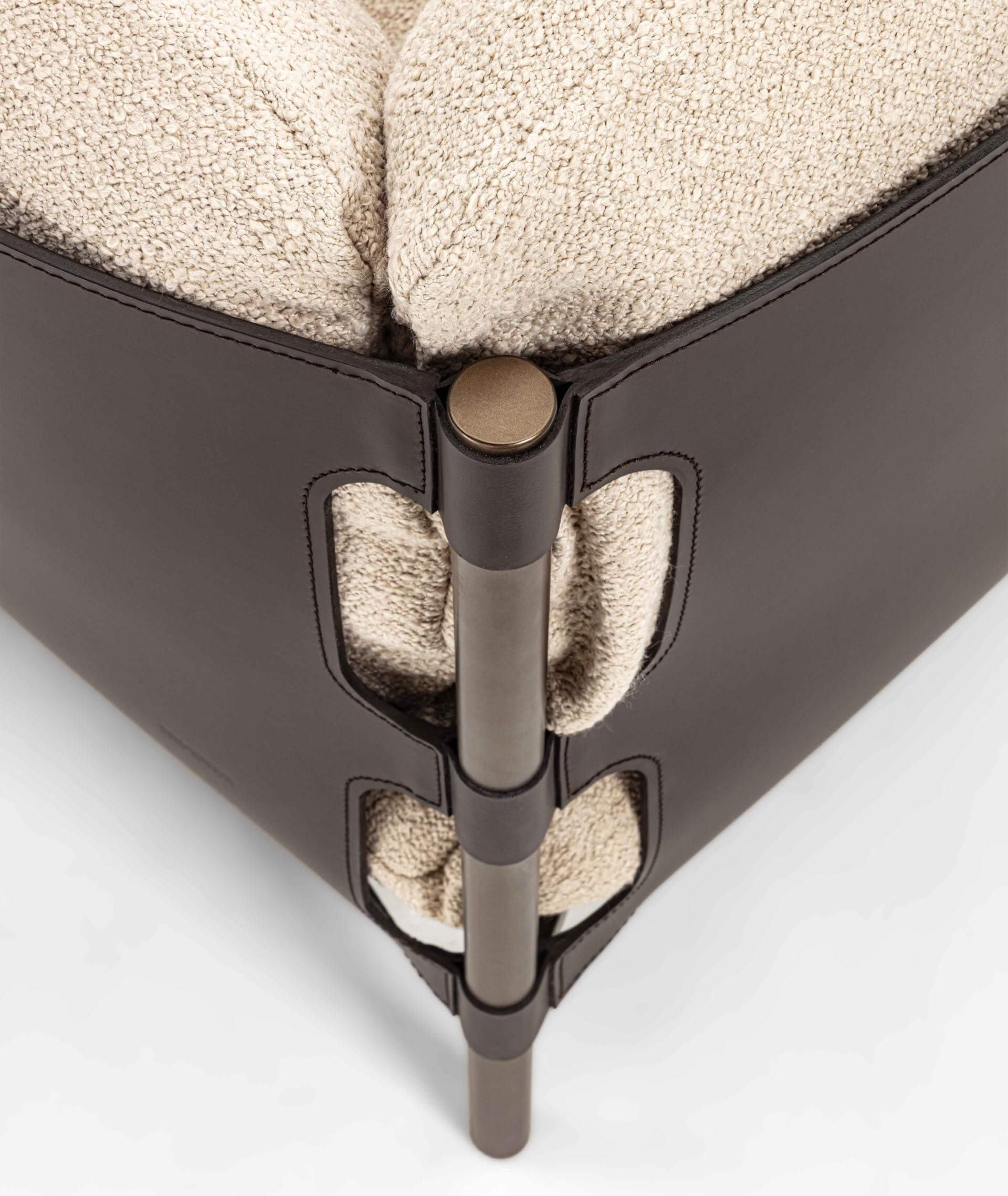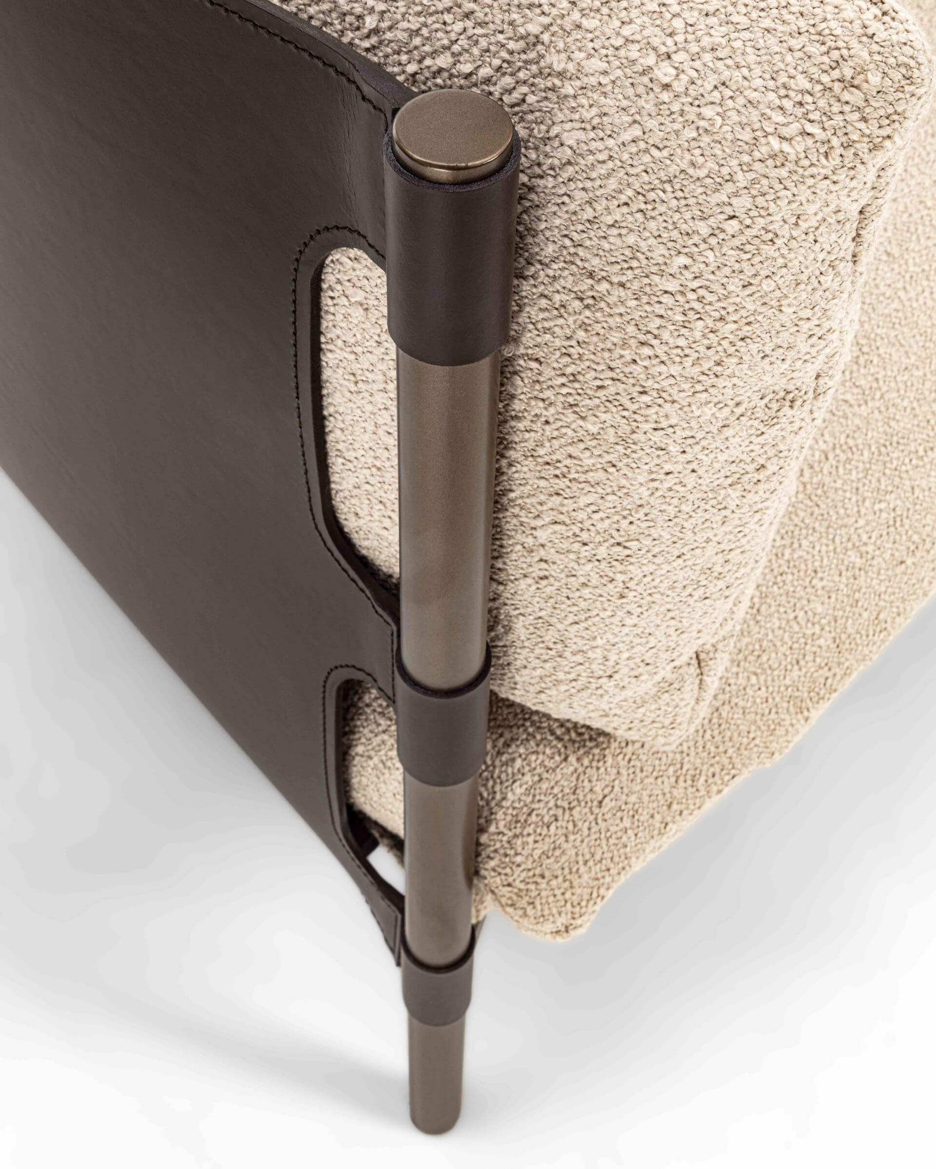 扶手椅,管狀金屬框架,多種塗裝飾面可選。 靠背墊填充鵝絨,座墊填充不同密度的鵝絨,可選配軟皮或布藝布料。 椅背和側板採用硬皮材質。