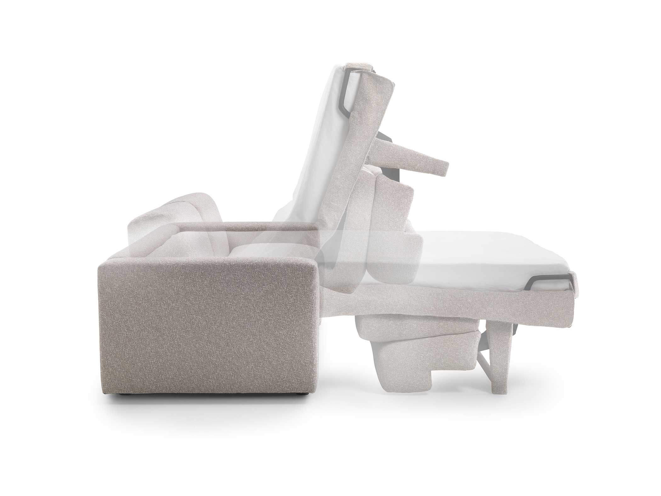 Logan沙發床的顯著特點之一是其簡潔流暢的現代線條,為整體設計增添了一絲優雅與精緻。其專利床體機械裝置極為便捷實用。得益於這個創新系統,沙發只需一個簡單的動作即可完成展開和折疊。無需再拆卸坐墊和靠墊,因為它們牢固地固定在機械裝置的結構上。這使得沙發與床之間的轉換過程快速且方便。