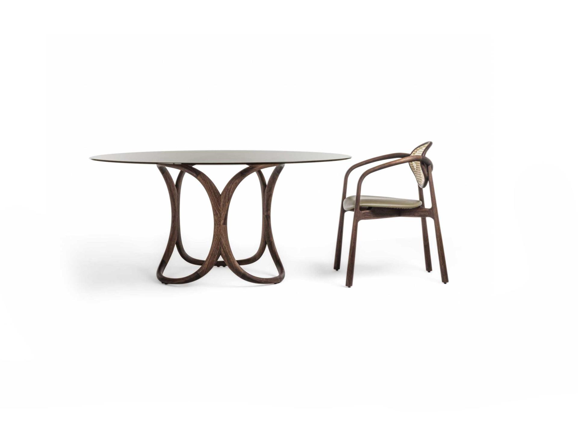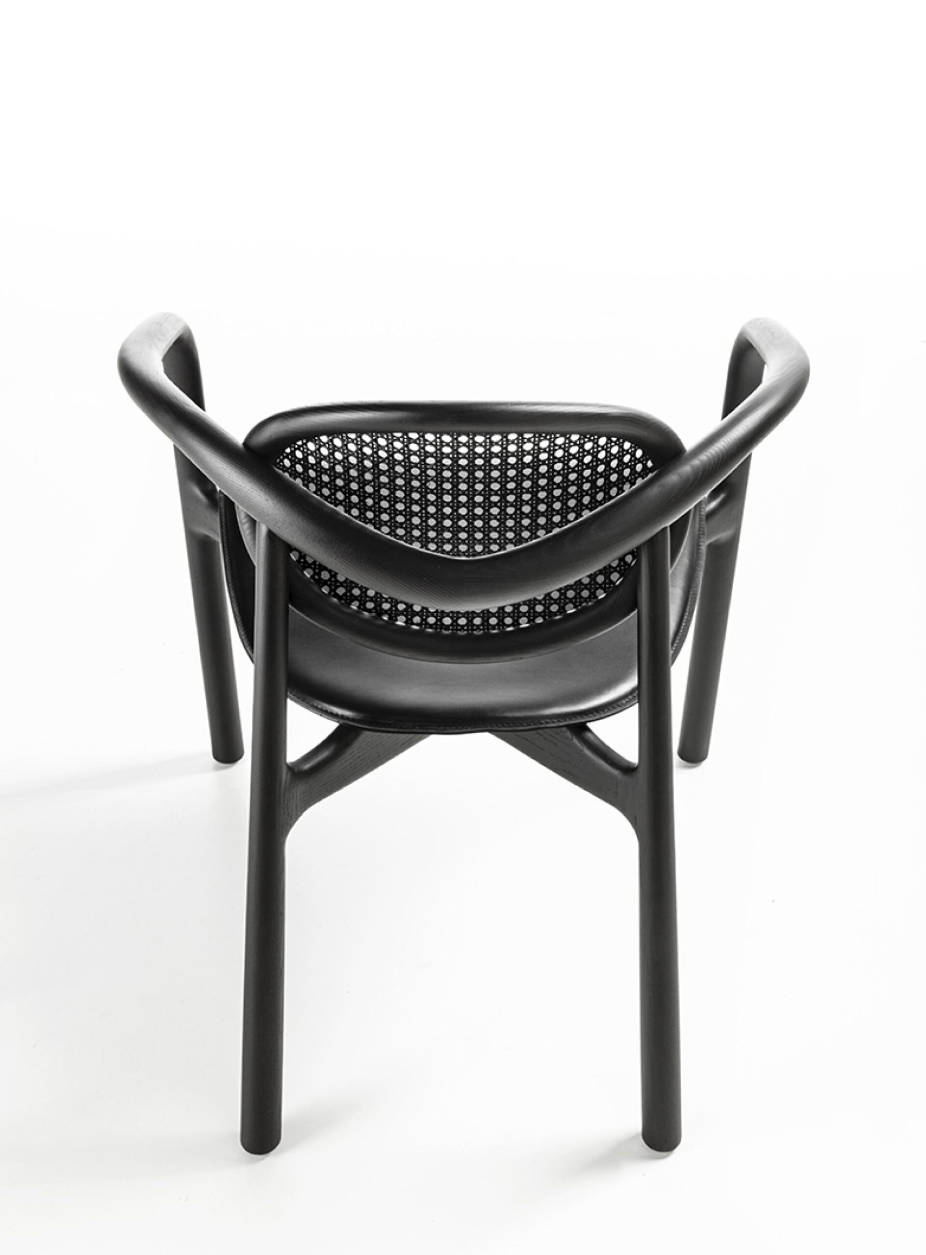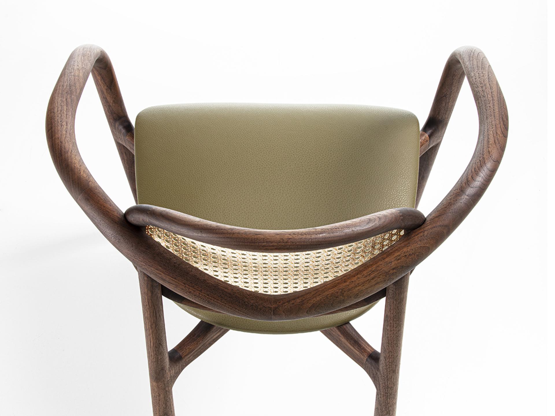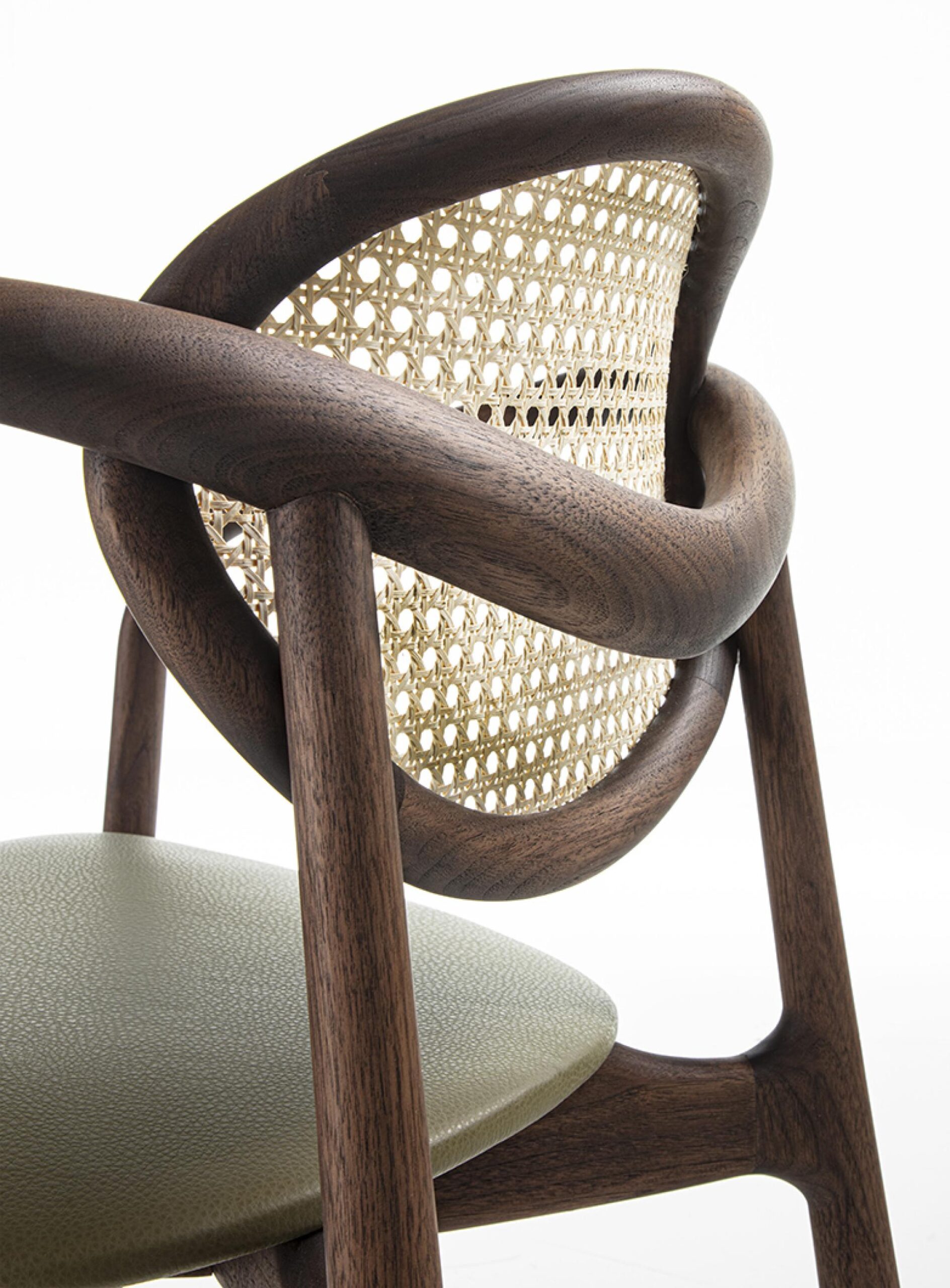 這款扶手椅採用實木框架,截面形狀不規則,可選材質為白蠟木或卡納萊托胡桃木。椅背採用維也納草編織而成,可選天然色或黑色。座椅布料有多種選擇。