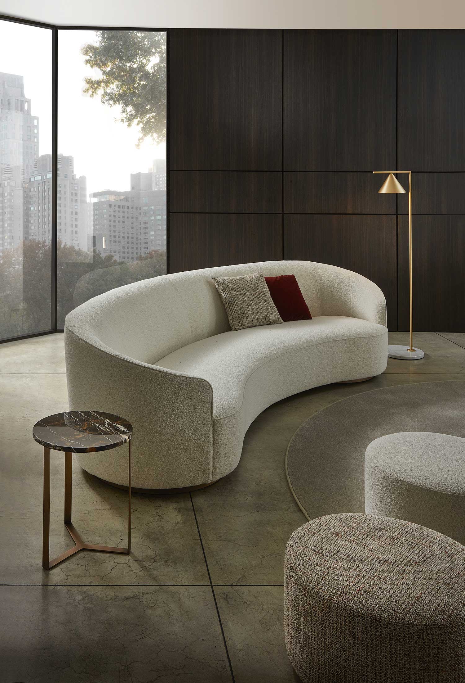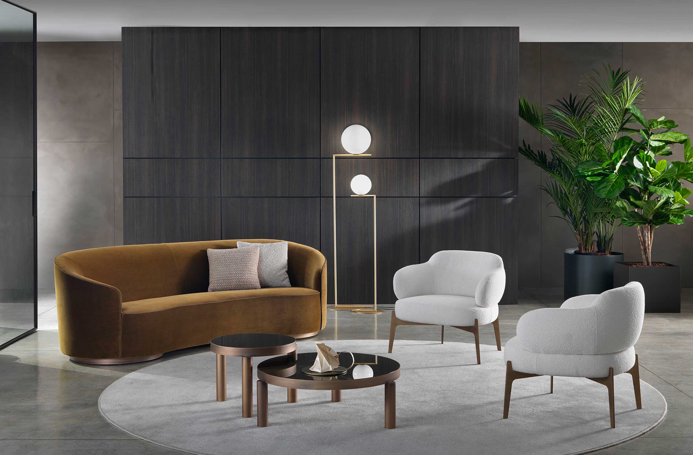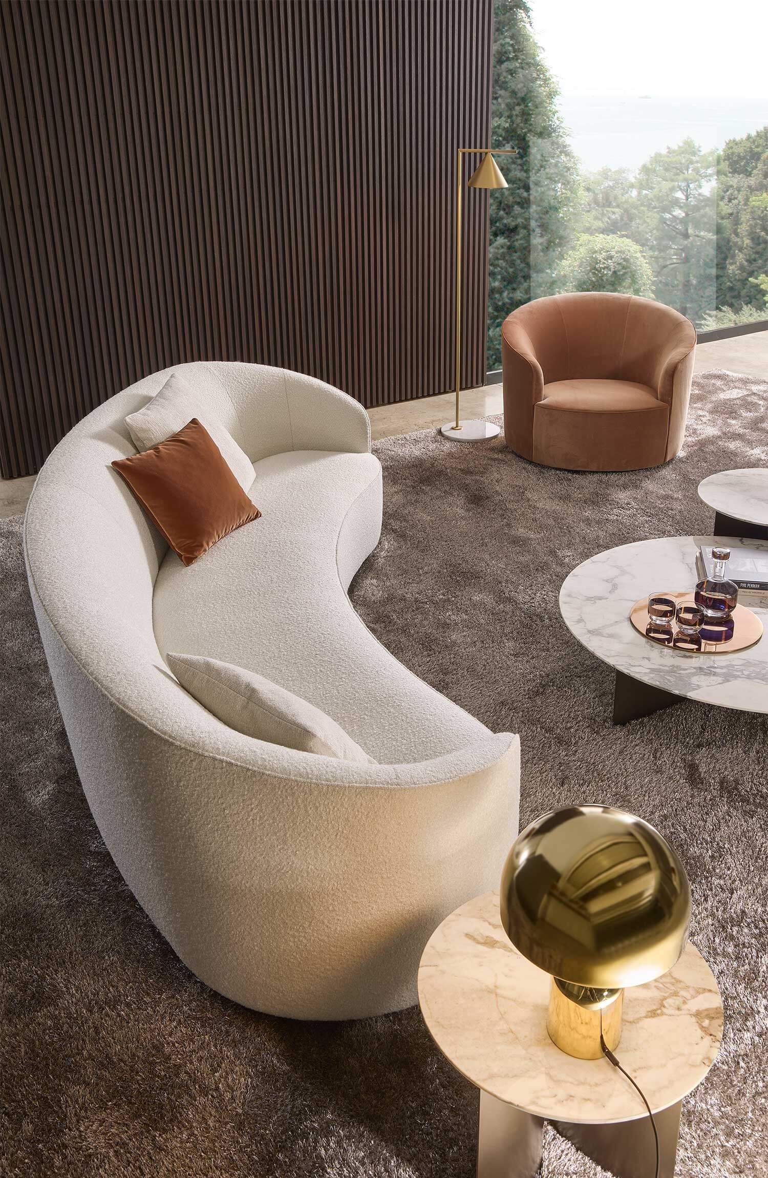 Moon 系列的沙發、扶手椅和腳凳以優雅的曲線為特色,軟墊部分採用柔和圓潤的造型,並配以輕盈的金屬底座。這種組合賦予了產品輕盈感,同時又不失穩重緊湊的體量。