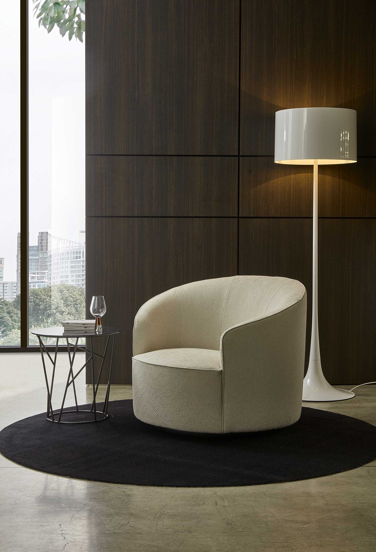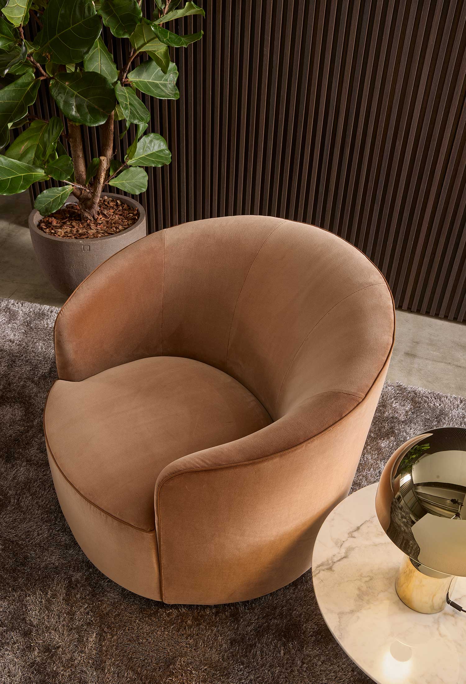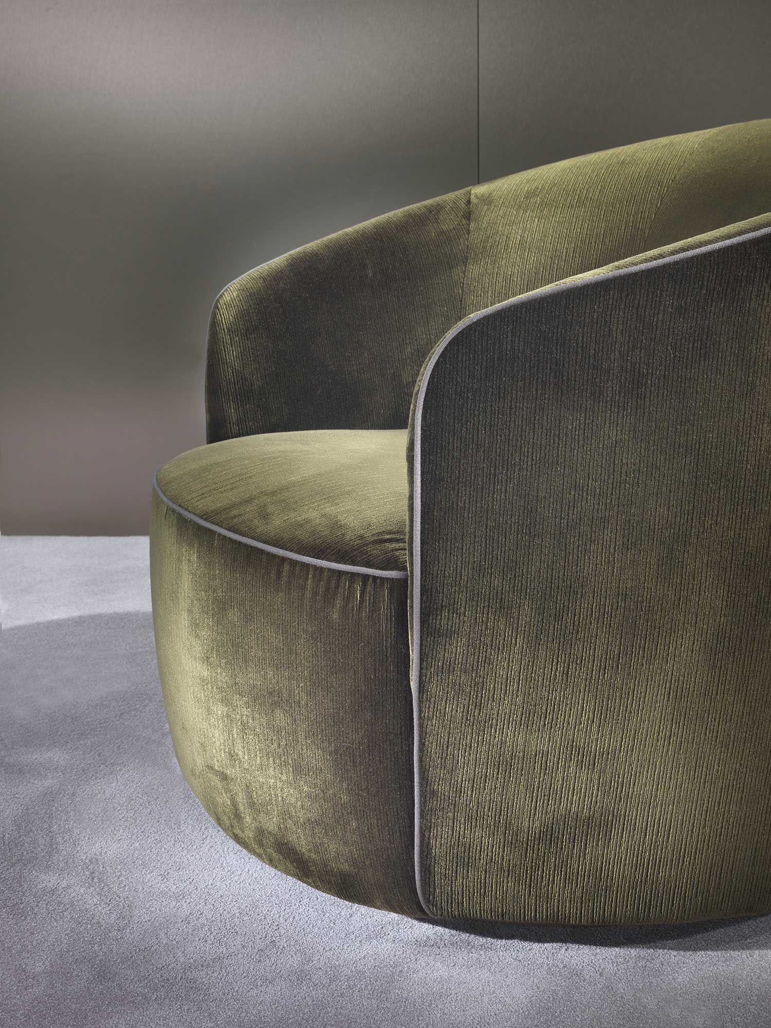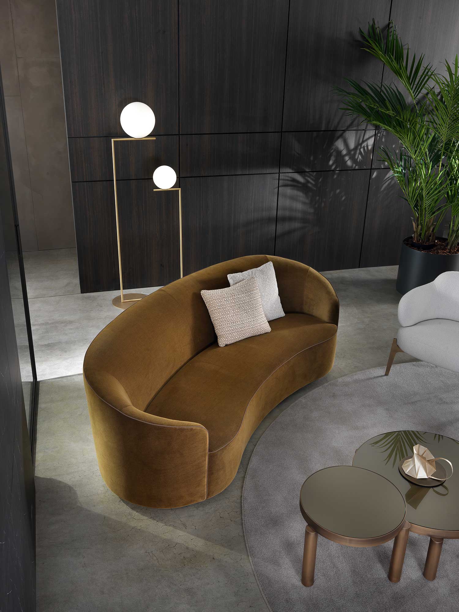 Moon 系列的沙發、扶手椅和腳凳以優雅的曲線為特色,軟墊部分採用柔和圓潤的造型,並配以輕盈的金屬底座。這種組合賦予了產品輕盈感,同時又不失穩重緊湊的體量。