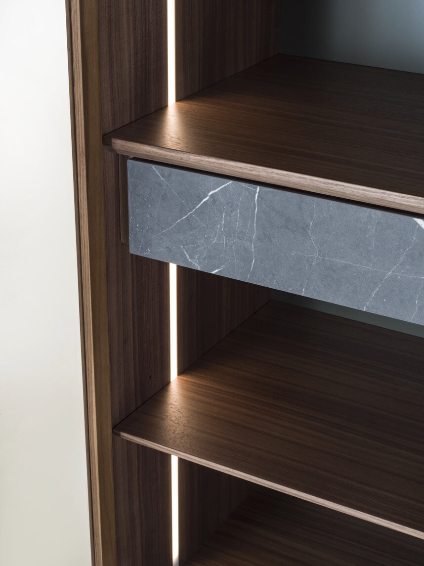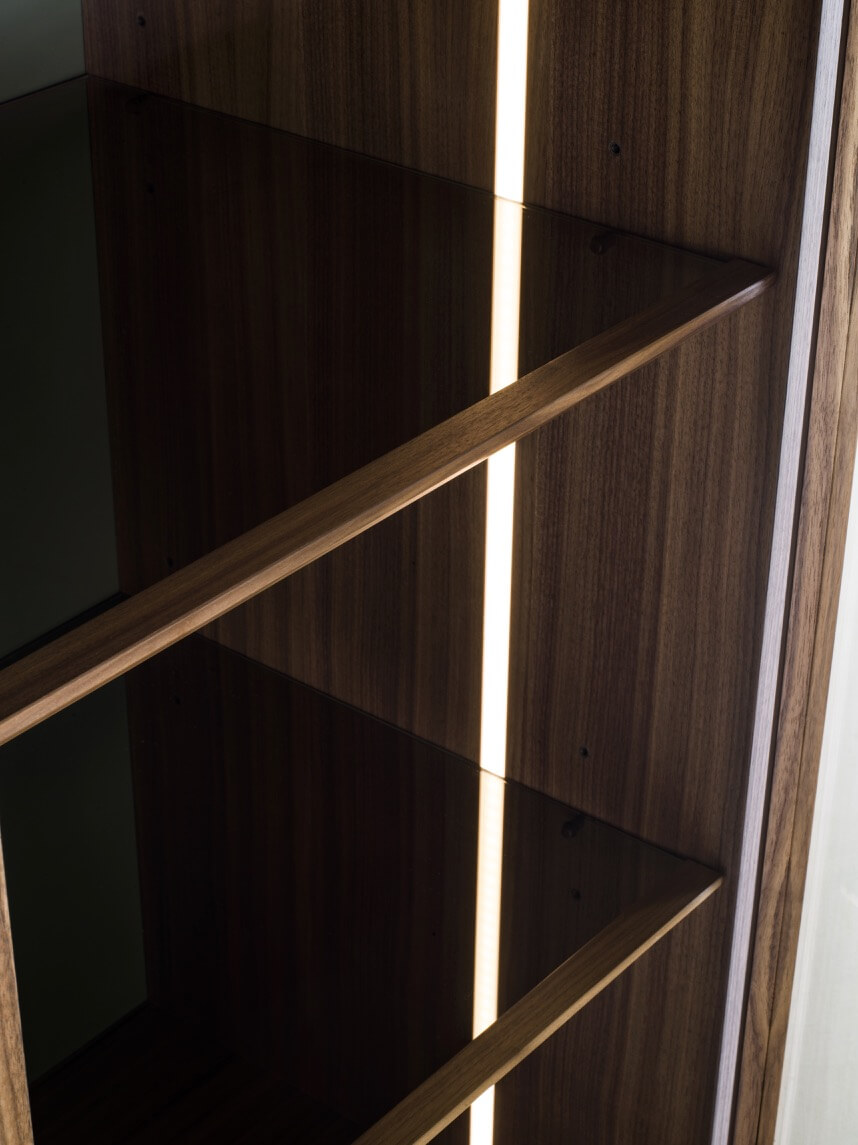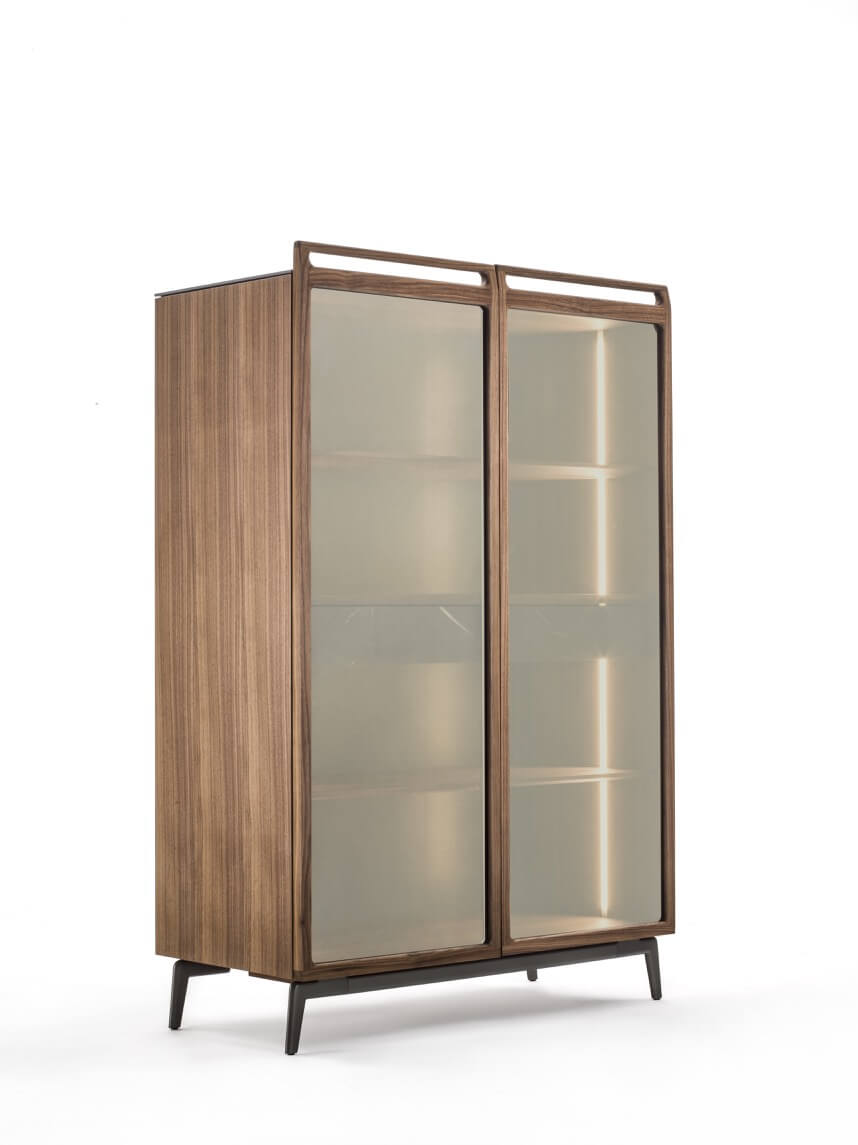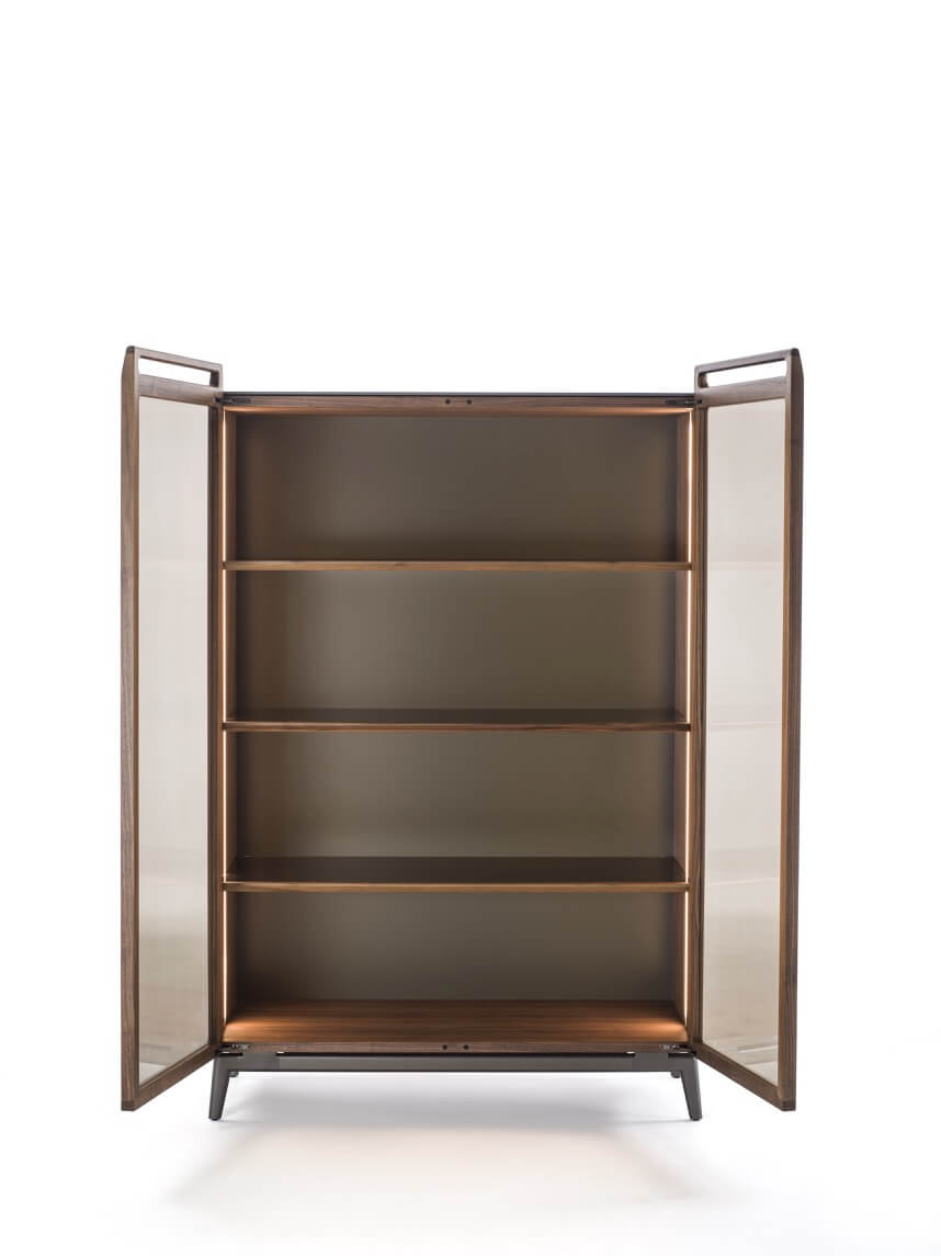 木質櫥櫃,配有兩扇玻璃門和實木把手。檯面可選木質或瓷質,底座為金屬材質。內部隔間採用木質層架,可選配抽屜(抽屜面板朝上),並配有LED照明。