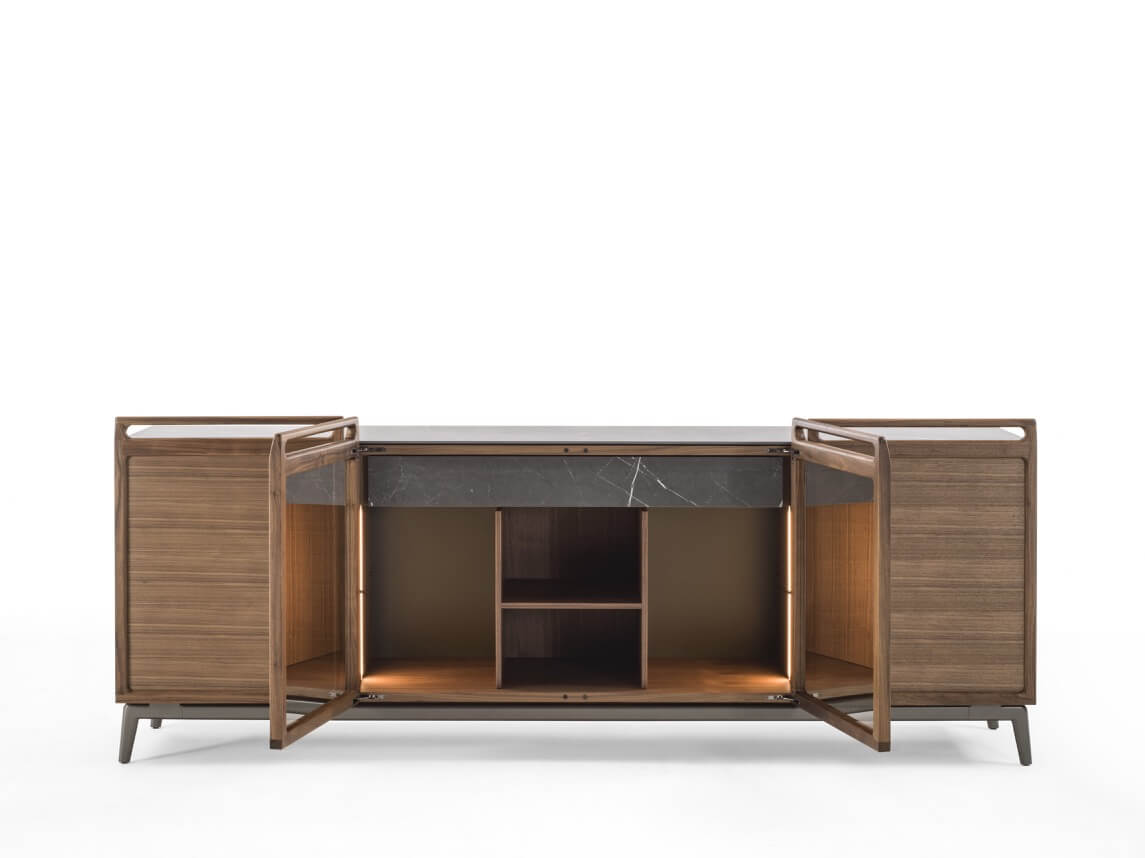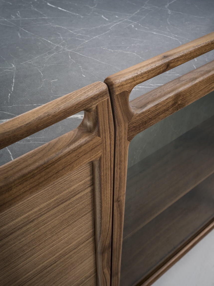 框架:實木胡桃木貼皮/實木橡木貼皮/實木黑橡木。 檯面:實木胡桃木貼皮/實木橡木貼皮/實木黑橡木/瓷質陶器。 門:實木胡桃木貼皮/實木橡木貼皮/實木黑橡木/木框玻璃。 桌腳:青銅烤漆金屬。