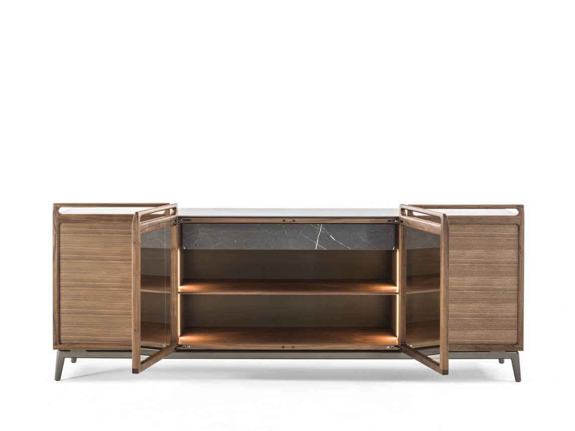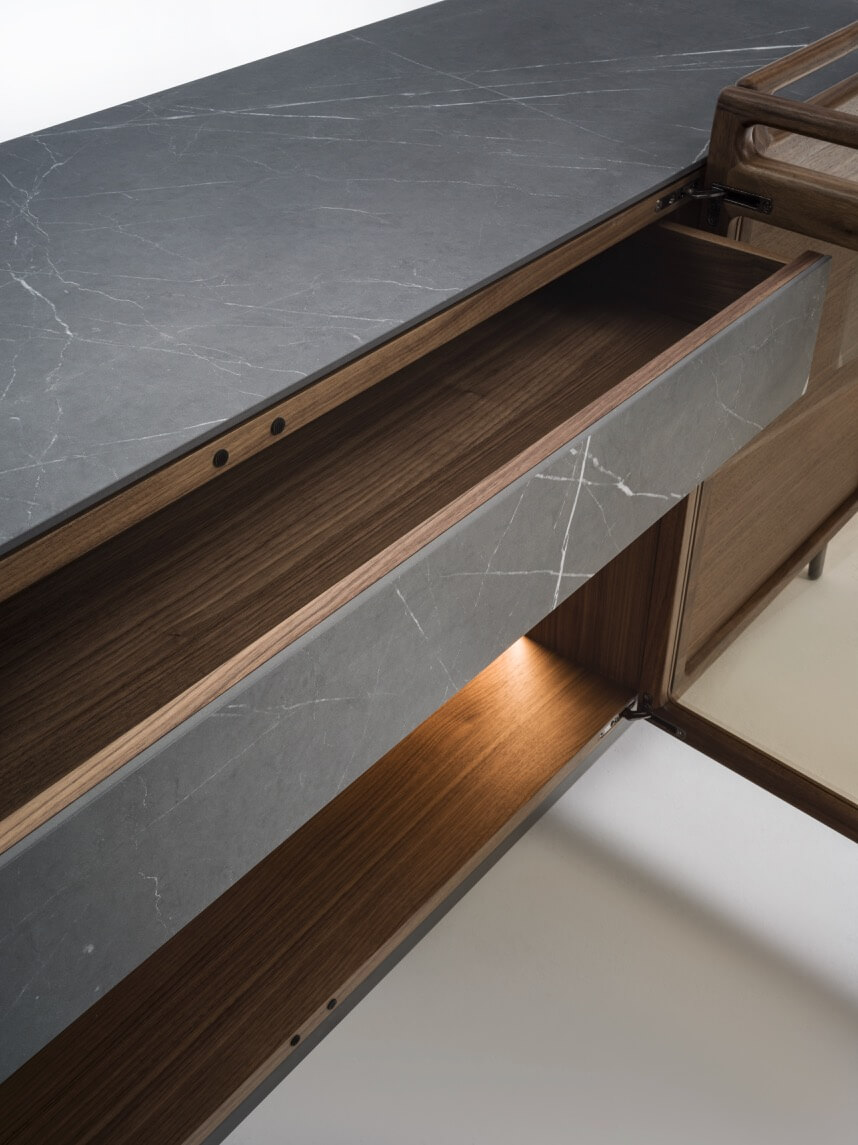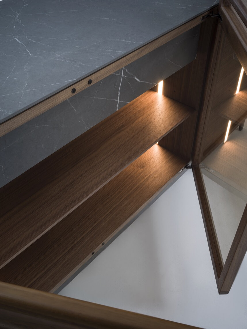 木質櫥櫃,配有三/四扇木質或水晶門,以及實木把手。檯面可選木質或瓷質,底座為金屬材質。內部隔間採用木質層架,可選配抽屜(抽屜面板朝上),並配有LED照明。