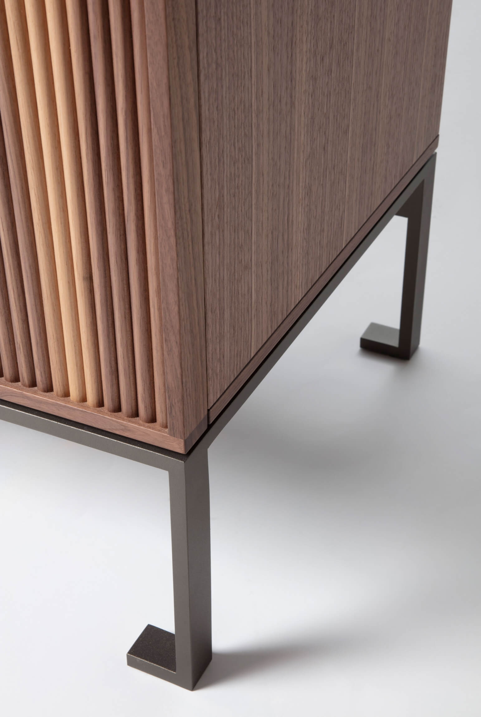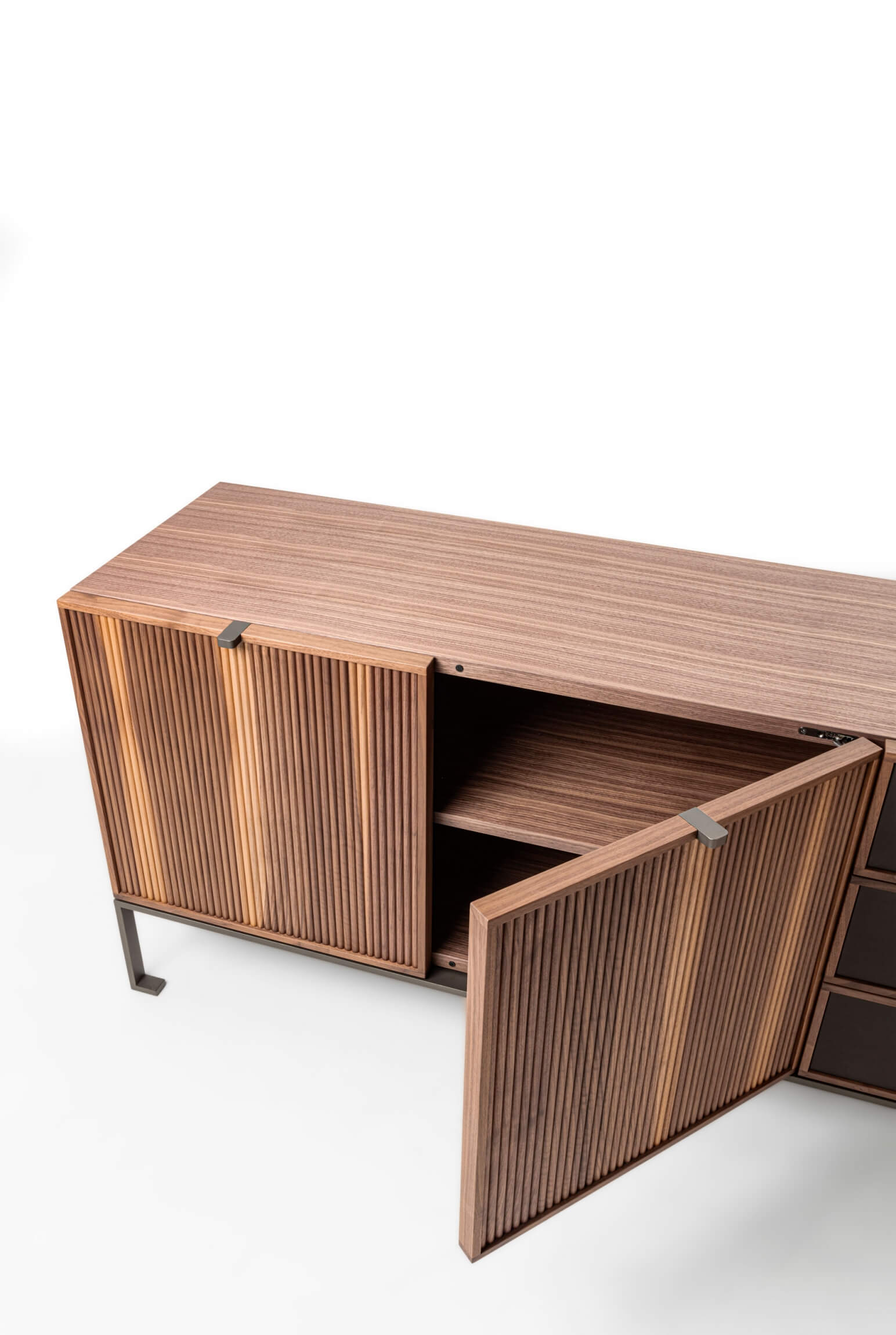 木質置物櫃,金屬底座。檯面可選木質或大理石材質,櫃門和抽屜均有多種款式可選,櫃門飾面可選羅紋或皮革飾面。內部隔板為木質。