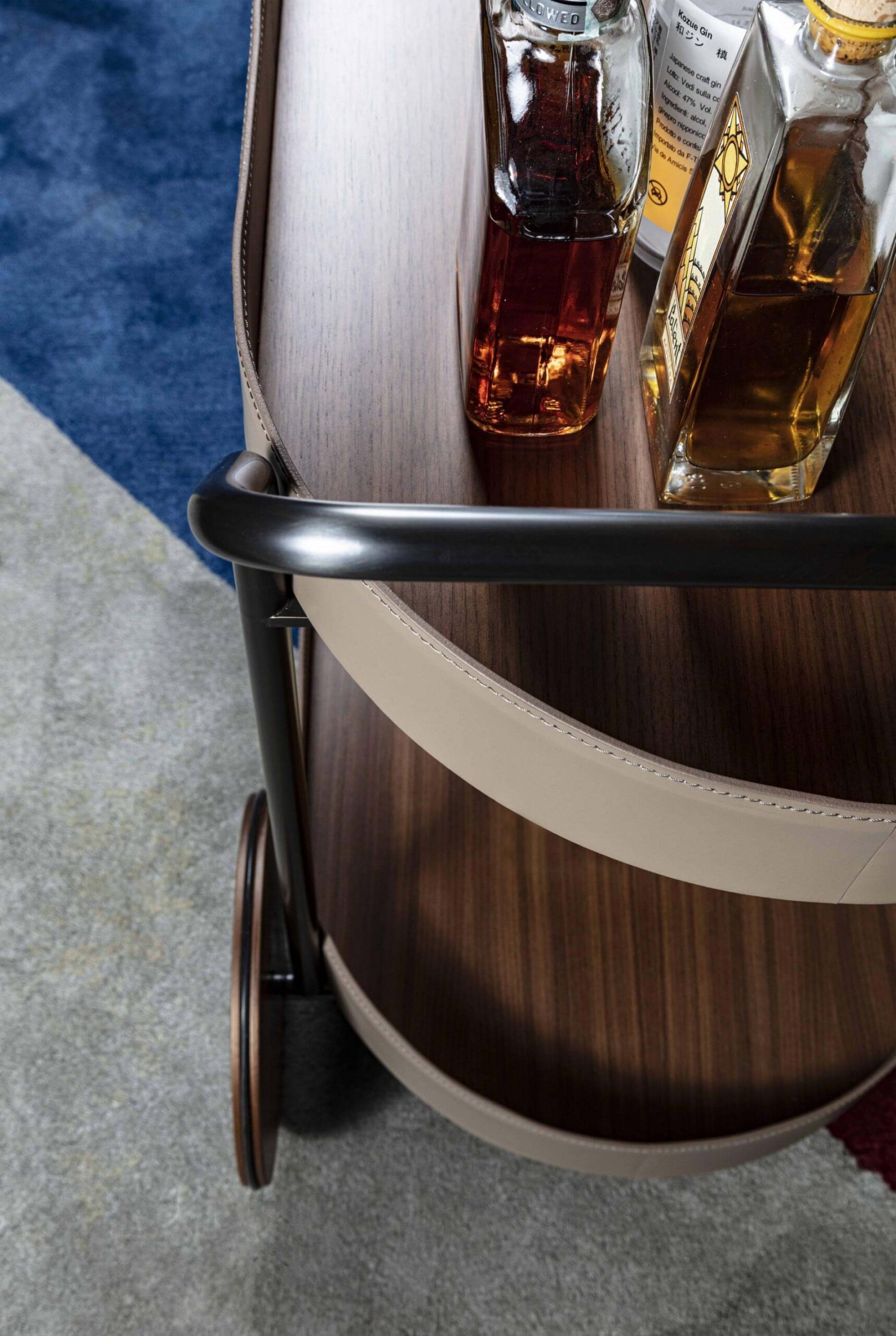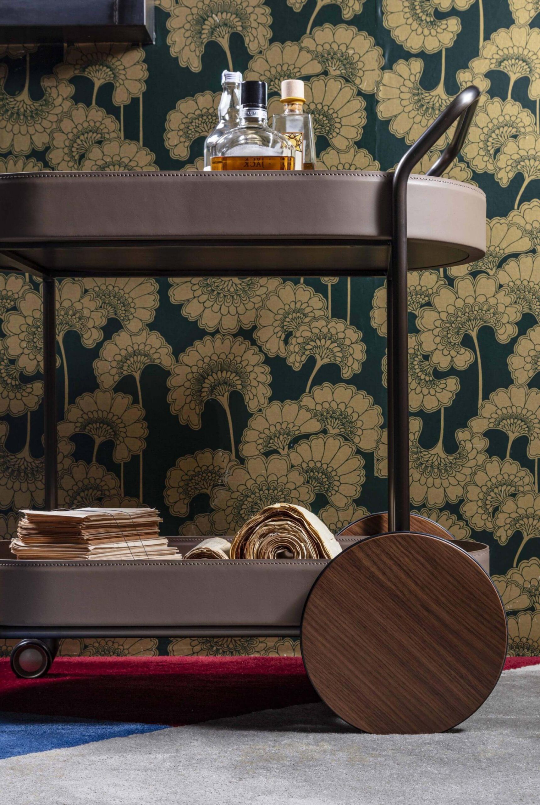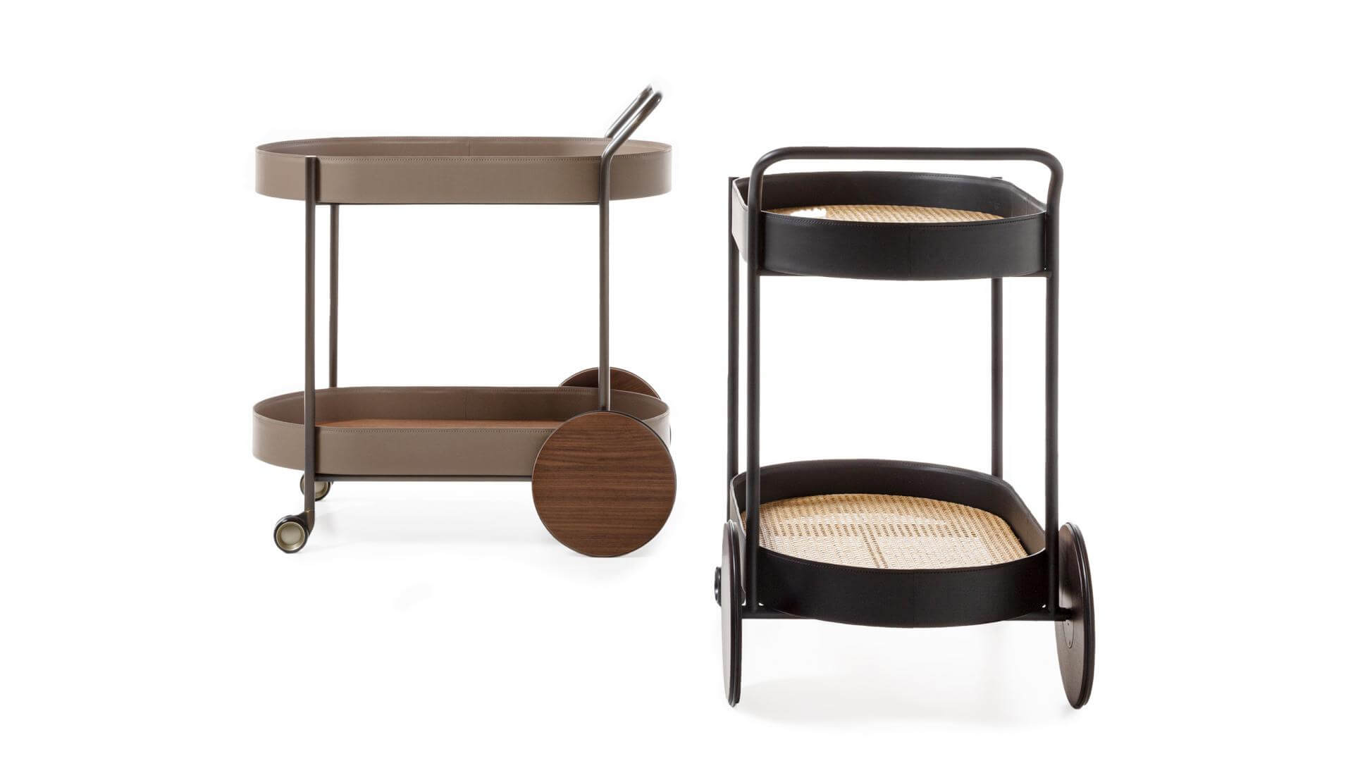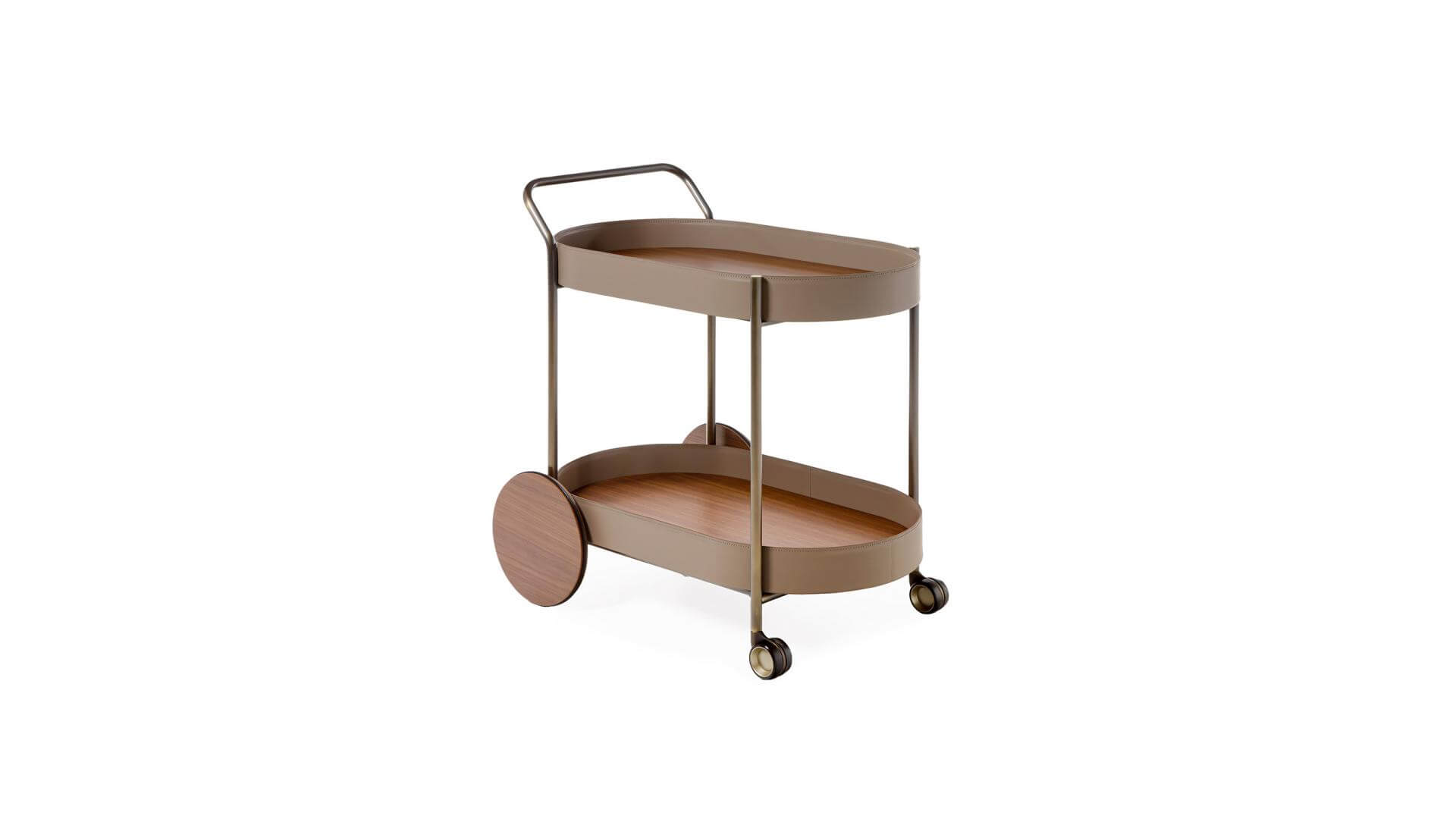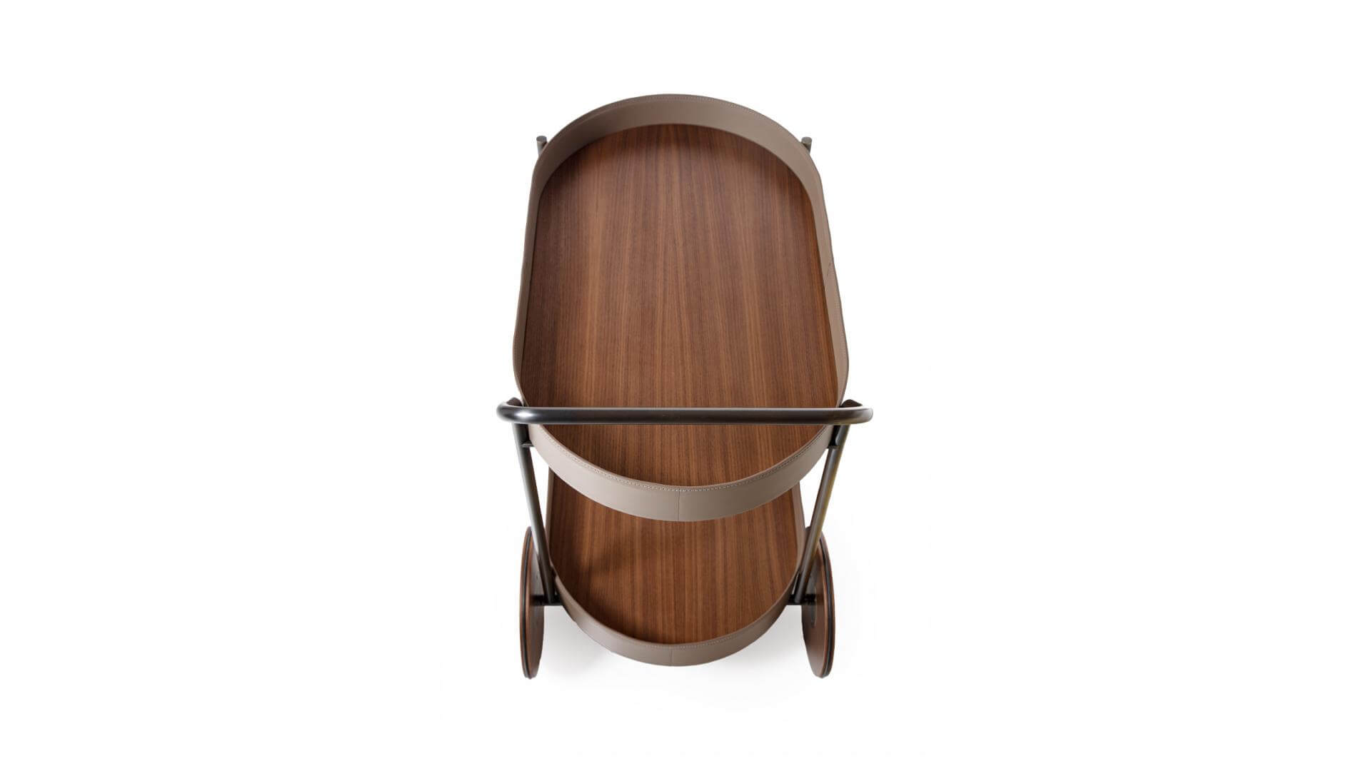 推車採用噴漆管狀金屬結構。 車輪和托盤為木質, 邊緣包覆皮革。