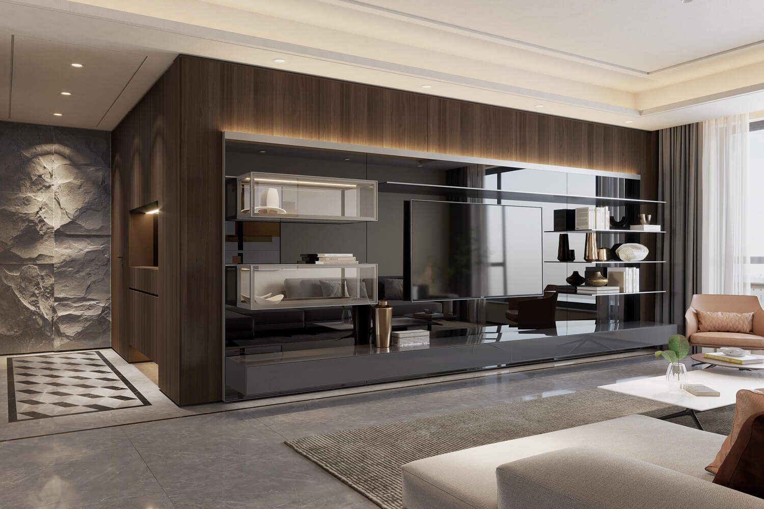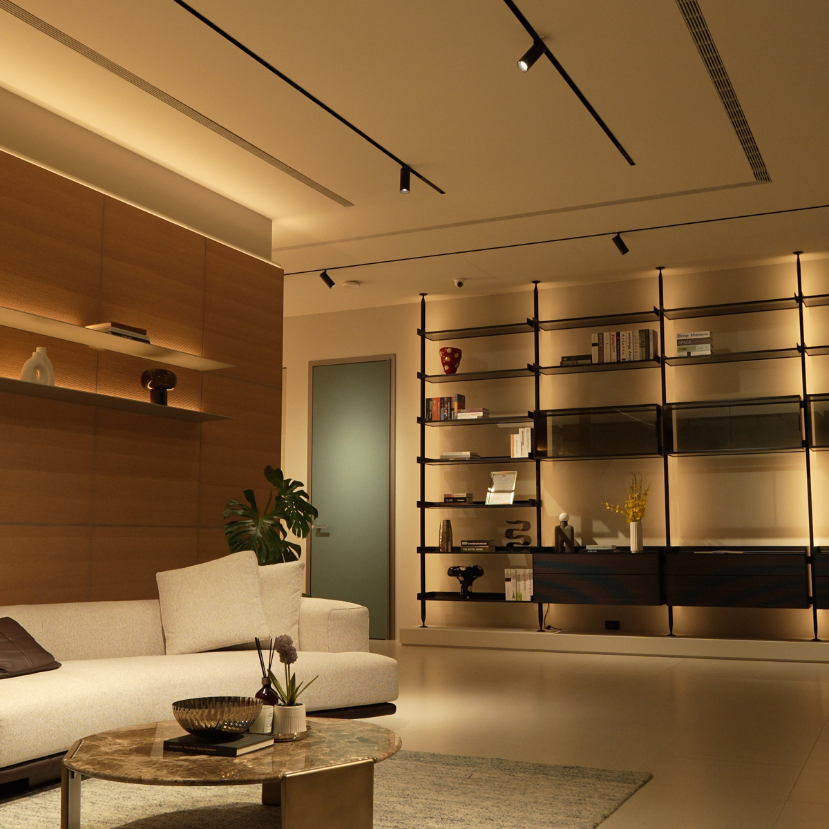 可選配的背光立柱帶來柔和的環境光感,而懸掛式櫃體與全鋁抽屜搭配全拉出緩衝滑軌,在維持輕盈視覺的同時,提供實用的書櫃收納與系統書櫃配置。