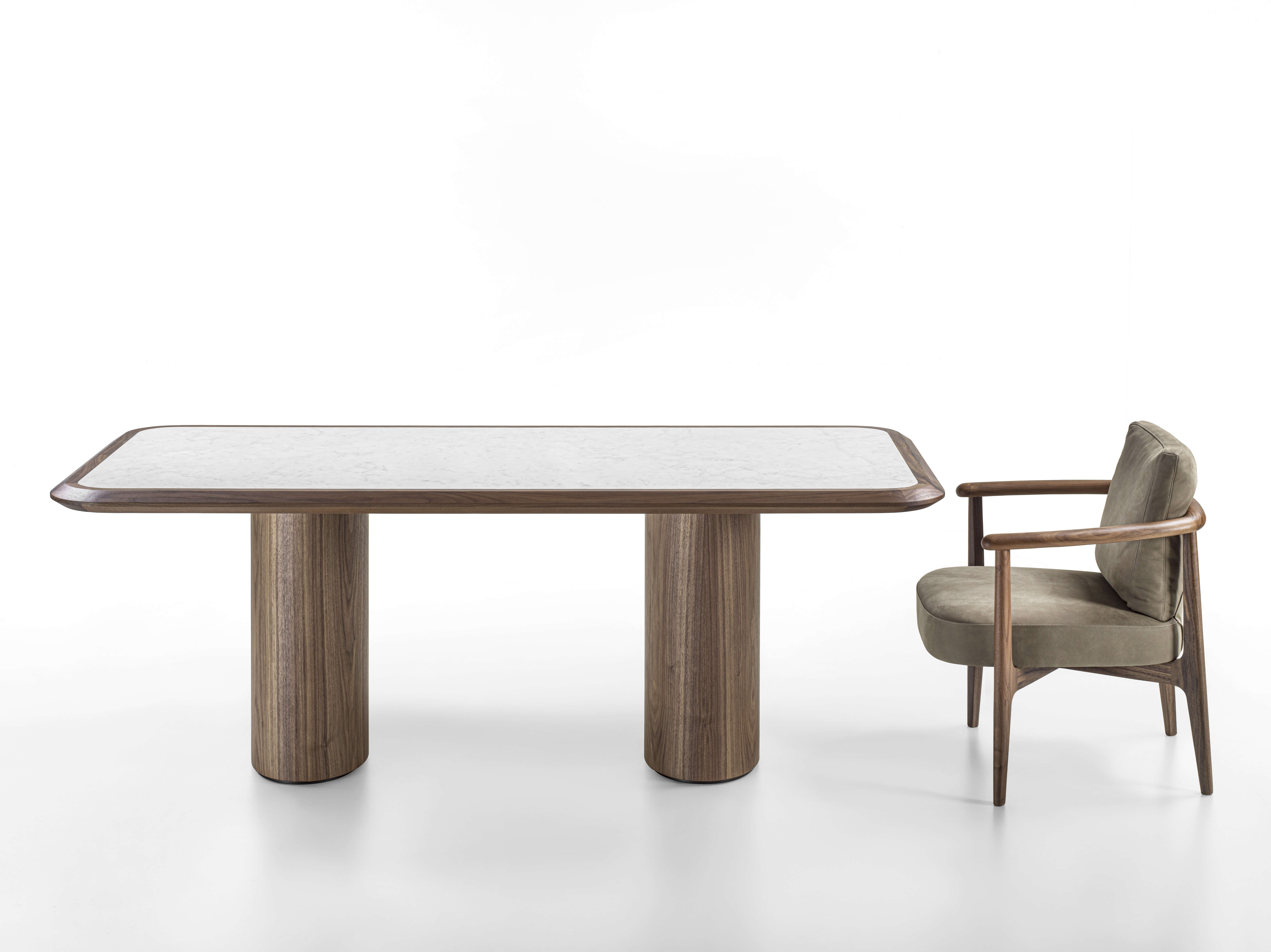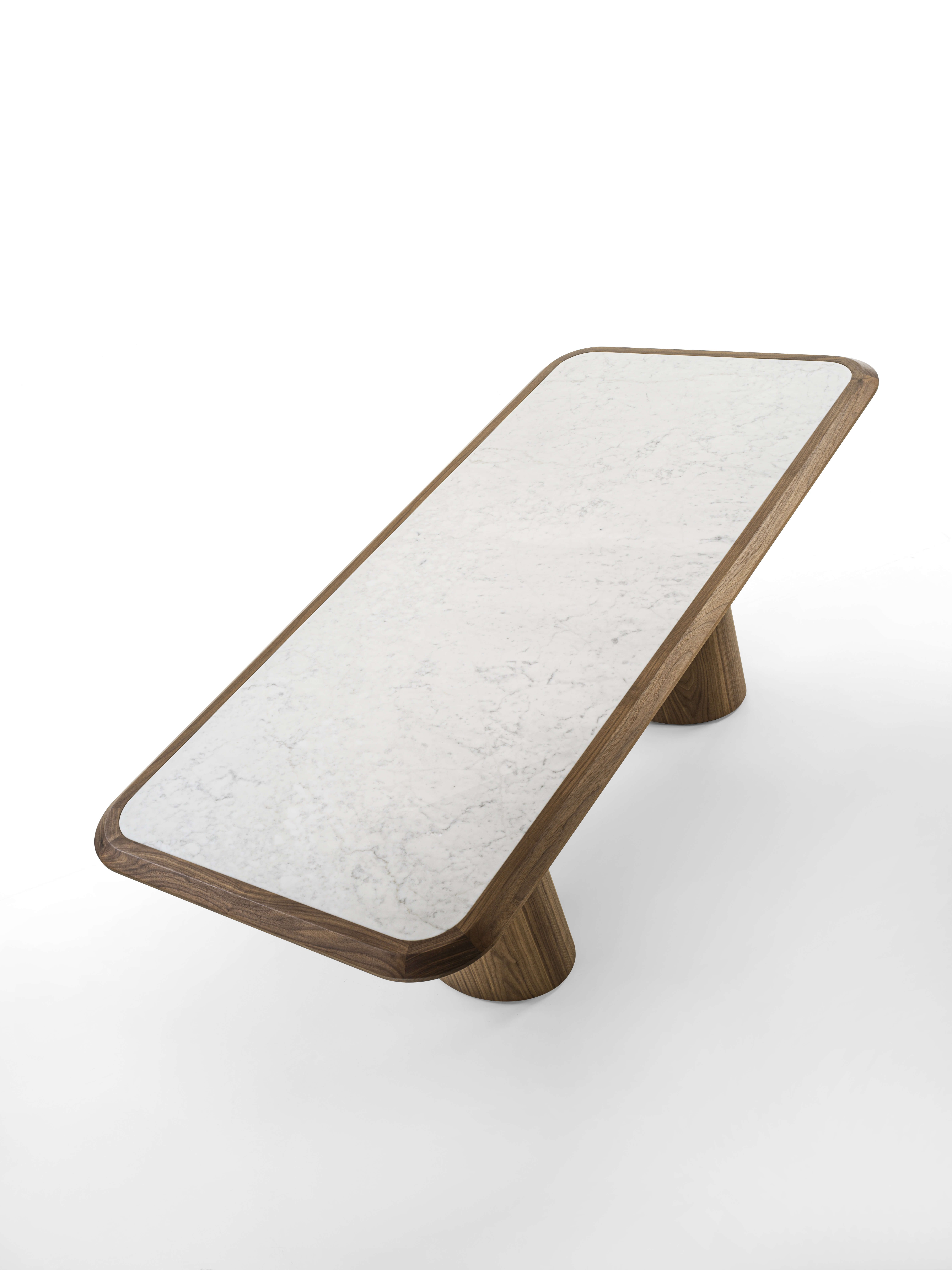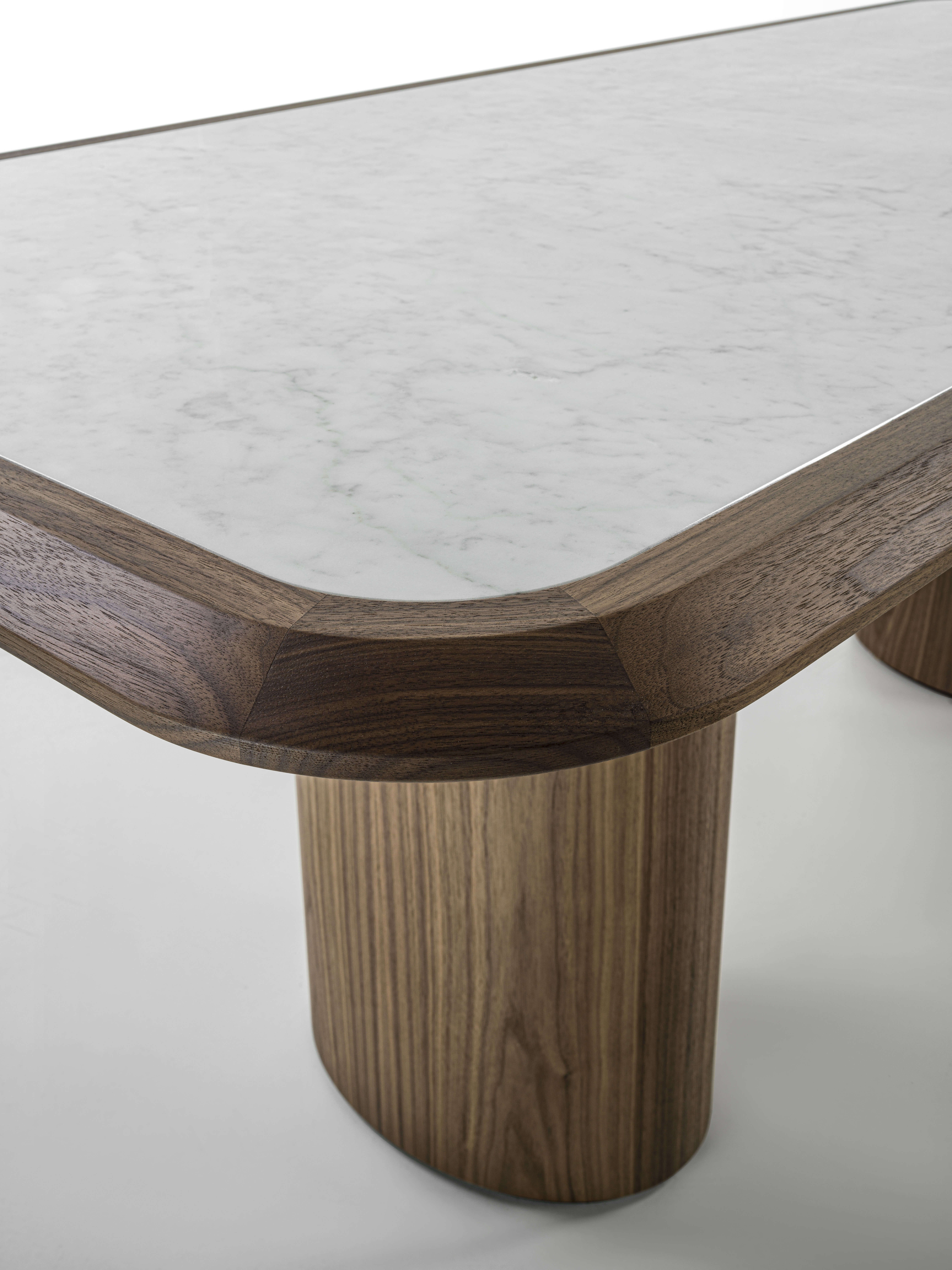桌子採用木質結構和桌腳,桌面以實木框架為特色,大理石桌面鑲嵌其中。