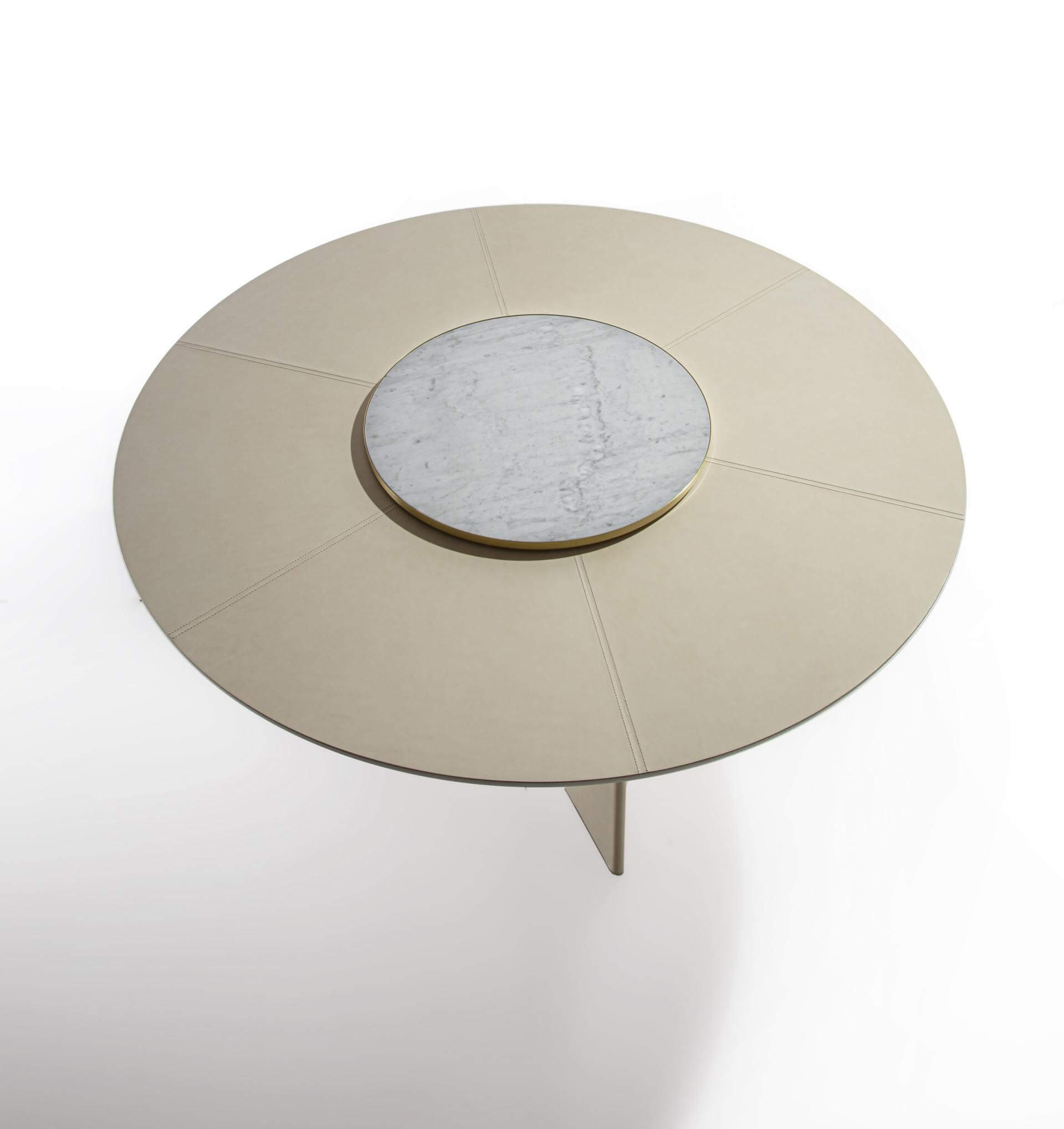 桌子中央底座為木質,外覆皮革,桌面亦為皮革材質,中央配有可旋轉的大理石檯面。是餐桌的理想選擇。