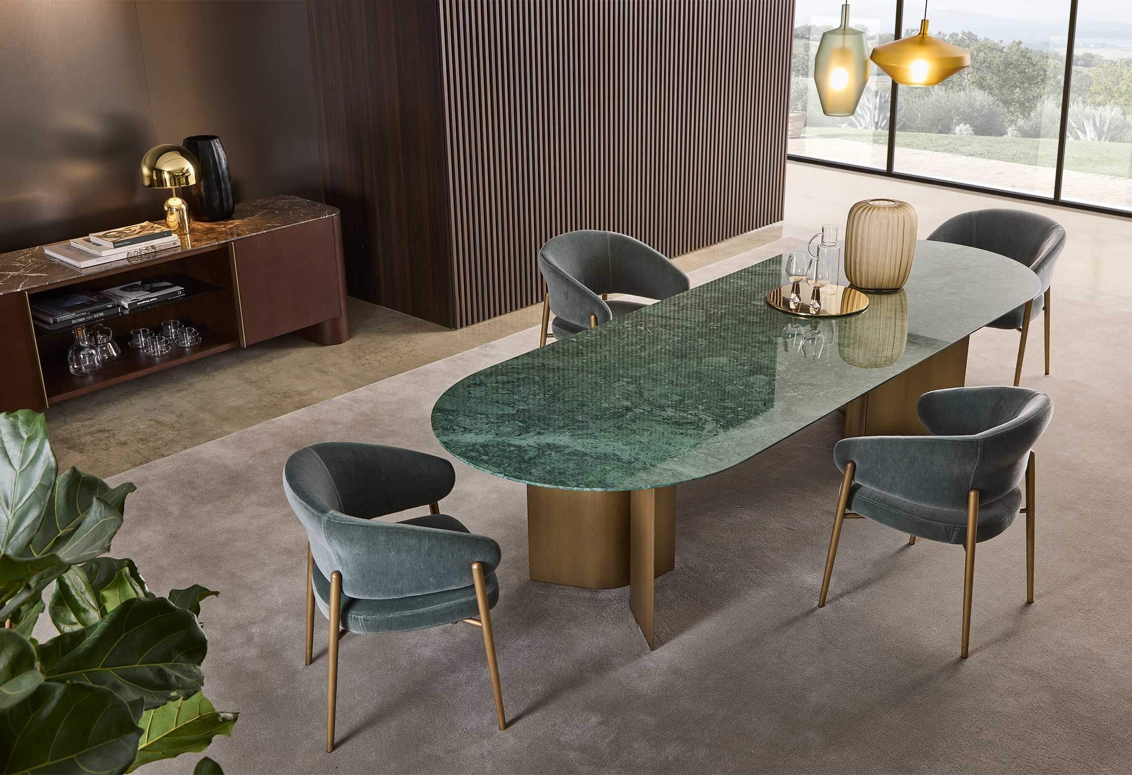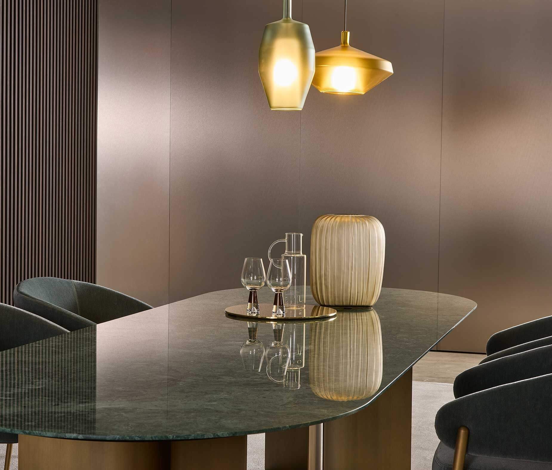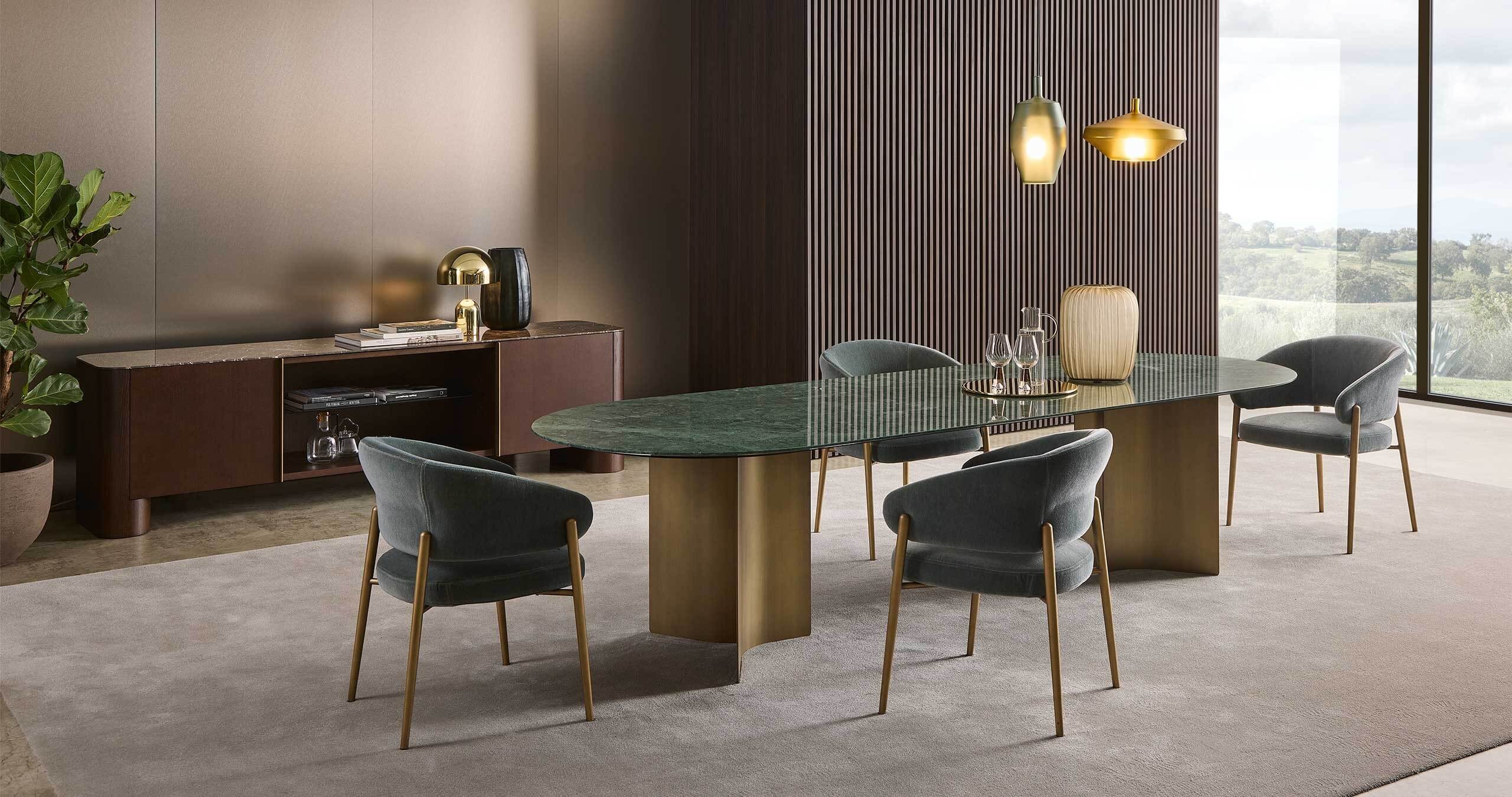 桌面可選18種珍貴大理石,並提供矩形或圓形兩種形狀,可滿足不同風格的客製化需求。大理石的選擇提升了該系列的精緻感,賦予其永恆的優雅氣質。